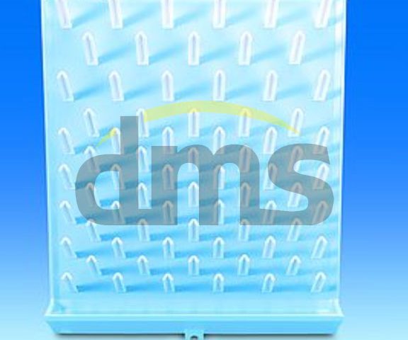With wide draining trough and drainage nozzles. Rack with 72 pegs 95 x 15 mm. For drying larger apparatus, some of the pegs can be removed and the bore holes closed at the rear. Delivered complete with drainage tube and accessories for the wall installation. In addition, 11 pegs (95 x 6 mm) are included for objects having a smaller diameter, such as reagent tubes.